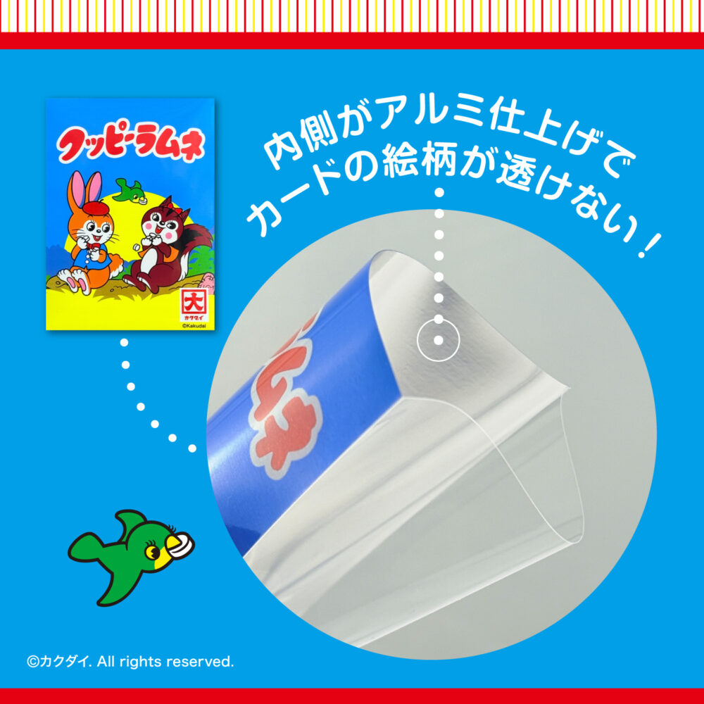 誰もが知っている、あの「クッピーラムネ」が、カードスリーブになって登場!他にはないレトロかわいいデザインで、普段使いはもちろん、コレクションにも最適です。