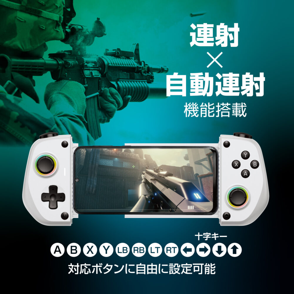 持ちやすさを考えた軽量設計で、スマホゲームを本格的に楽しみたい方に向けた他機種対応スマホコントローラーです。バッテリー容量は800mAh、約3~5時間の充電で持続プレイ時間は約10時間!移動中や外出先でもゲームを楽しみたい方に最適です。