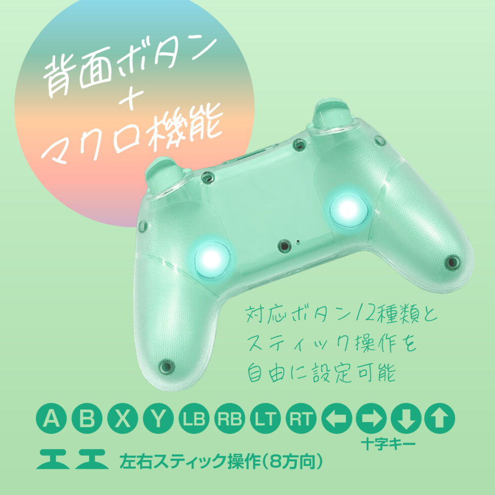 連射機能、連射ホールド機能、ジャイロセンサー、加速度センサーを標準装備。また、マクロプログラミング機能により、自分のスタイルでアクションをプログラムしたり、ボタンの順序と時間を記録し設定するなど、様々なゲームで自由度の高い操作が可能に!背面ボタンも搭載され、楽しみ方は無限大です。ボタンの割り当てや編集はプログラミングモードで行えます。チャットボタン、イヤホンジャックは付いておりません。