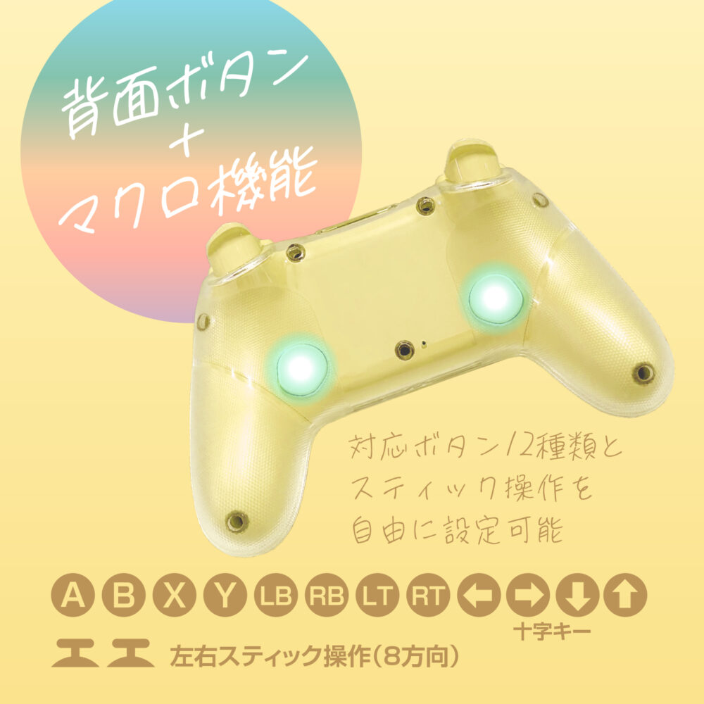 連射機能、連射ホールド機能、ジャイロセンサー、加速度センサーを標準装備。また、マクロプログラミング機能により、自分のスタイルでアクションをプログラムしたり、ボタンの順序と時間を記録し設定するなど、様々なゲームで自由度の高い操作が可能に!背面ボタンも搭載され、楽しみ方は無限大です。ボタンの割り当てや編集はプログラミングモードで行えます。チャットボタン、イヤホンジャックは付いておりません。