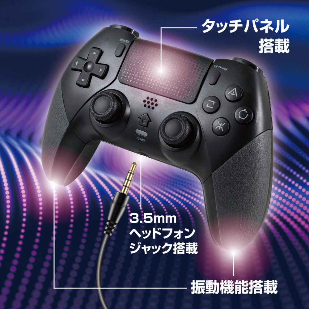 本製品はPS5対応無線コントローラーです。(2.4Ghzドングルでの無線接続になります)振動機能やタッチパッド、ジャイロセンサー、オートスリープ機能が搭載されています。